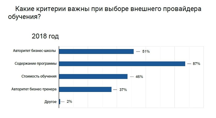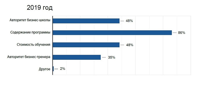 Главный фактор при выборе провайдера обучения (для 86% респондентов) — содержание программы, а стоимость курса и авторитет бизнес-школы делят второе место (48% опрошенных).